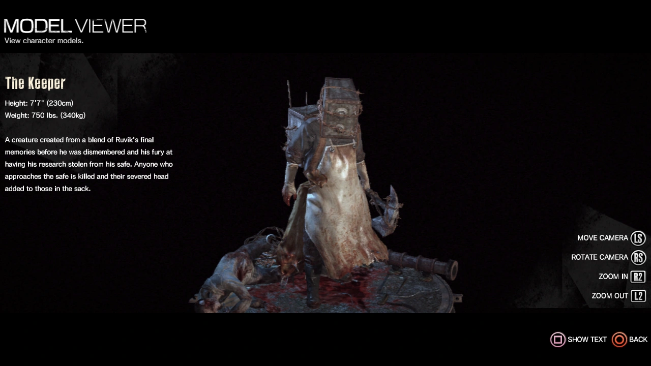A creature created from a blend of Ruvik's final memories before he was dismembered and his fury at having his research stolen from his safe. Anyone who approaches the safe is killed and their severed head added to those in the sack.